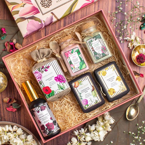This hamper box contains: � Pure Rose Water � French Pink Clay � Glacial Green Clay from New Zealand � Handcrafted Coconut Milk Soap N Handcrafted 24KT Gold Soap in Rustic Burlap Bag
