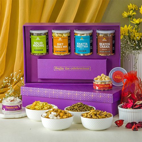 The gift box consists of: � Solid Moong Spicy Masala (65g) � Khatta Meetha Mix (65g) � Diet Flakes Mix (45g) � Beaten Chana Protein Rich (60g) � Gur Chana x 1 � Thandai Mix x 1 � Scented Potpourri x 1 � Premium Gift Box Packing