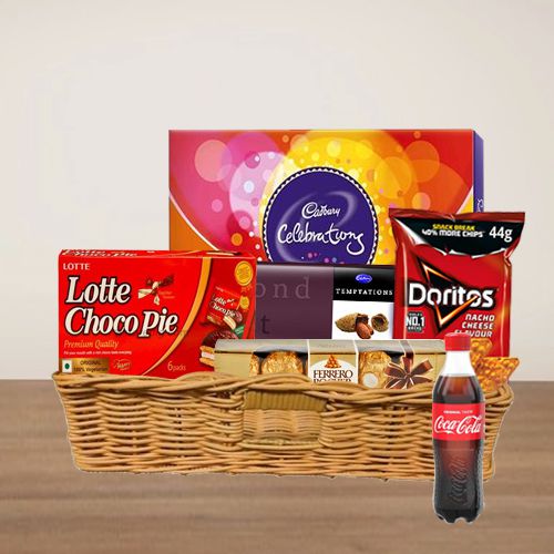 Engage in the true spirit of celebration with this Heavenly Chocolate N Chips Indulgence Hamper that instantly uplifts the mood. This gift hamper consists of: 1. Cadbury Celebration Pack (118g) 2. 4pcs Ferrero Rocher 3. Cadbury Temptation (72g) 4. Doritos Nachos Chips (44g) 5. Lays Chips 6. Coca Cola 7. Choco Pie with Marshmallow (168g box) 8. A Gift Basket