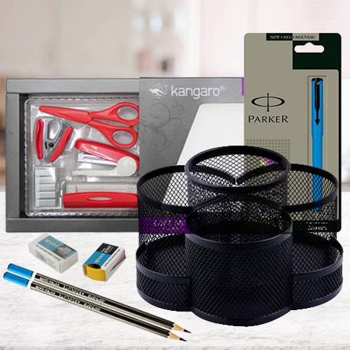 Convey your special wishes with this Exclusive Desktop Organizer Gift Set as you enhance happiness in the lives of your boss and colleagues. This Hamper is filled with- 1. Callas 360 degree Rotating Pen Stand for your office desk 2. Parker Beta Standard Ball Pen 3. Kangaro SS-10 Y Manual Staplers - Attractive gift pack including stapler, paper punch, stapler remover, scissors and staple pin box from Kangaroo 4. 2 pcs Apsara Pencil 5. 1 pc Non Dust Eraser from Apsara 6. 1 pc Sharpener