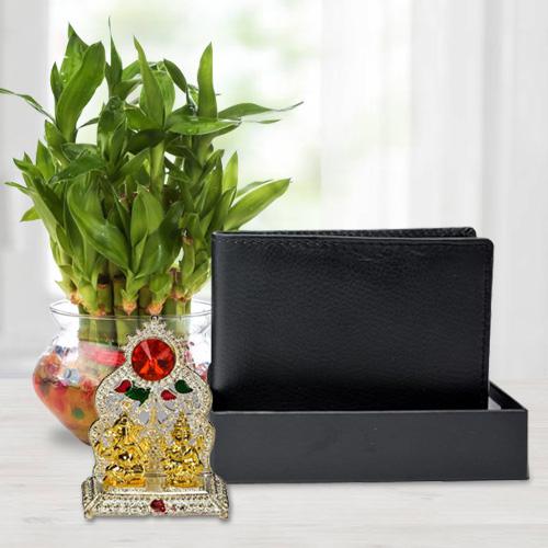 Amaze your loved ones by gifting them this Classic 2 Tier Good Luck Bamboo Plant with a Gents Black Colour Leather Wallet from Rich Born having multiple card slots n coin pocket n an auspicious Laxmi Ganesh Mandap and make them crave for more.