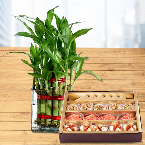 Send this Delightful Gift of Two Layer Lucky Bamboo Plant in Glass Pot with 500 gram Assorted Haldiram Sweets to your special ones to make them happy.