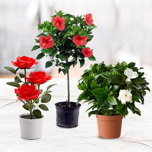 Win the hearts of your dear ones by this Botanical Gift Set of Good Luck Flowering Plant and show your fondness. This magnificent selection of Floral Plant set is accompanied with Red Rose Plant, Tropical Hibiscus Plant and Jasmine Plant delicately arranged in a Plastic Pots. Plant Type - Indoor - Flowering Plant Plant Size - 3 to 7 inch Pot Size - 3 to 4 inch