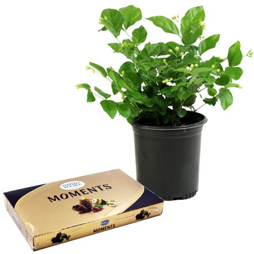 Merge your love with this Aromatic Jasmine Plant with 16pc Ferrero Rocher Moments Chocolate and send it to your dearest ones. Plant Details: a) Product Content - Jasmine Plant b) Type - Medicinal Plant c) Plant Placement - Outdoor d) Plant Height - 3 to 7 Inches e) Container - Black Tub