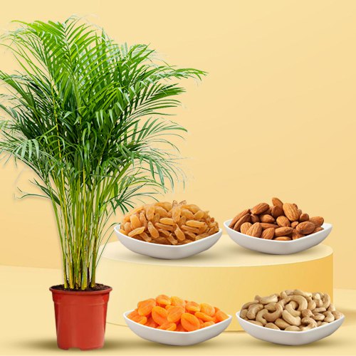 Bring the feeling of happiness by sending this Air Purifying Areca Palm Plant with Healthy Dried Fruits into the life of your most special person. Product Details: a) Areca Palm Plant b) Almond (50gm) c) Raisin (50gm) d) Cashew (50gm) e) Turkle Apricot (50gm)