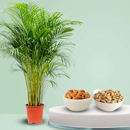 Merge your love with this Air Purifying Potted Areca Palm Plant with Almonds N Cashews and send it to your dearest ones. Product Details: a) Areca Palm Plant b) Almonds (100g) c) Cashew (100g)