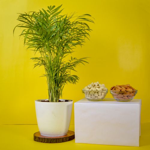 Present this gift of Cheerful Table Palm Plant with Assorted Dry Fruits Bliss and make the recipient�s day special. Product Details: a) Table Palm Plant b) Assorted Dry Fruits (200g)