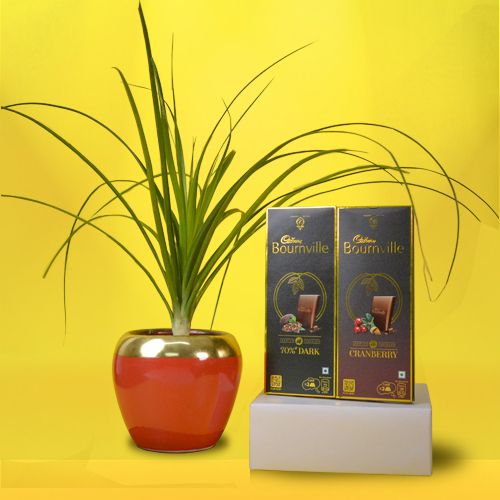 Make others feel very happy as you send this Premium Pony Tail Palm Plant with Chocolaty Treat and let them feel special. Product Details: a) Pony Tail Palm Plant b) Bournville Raisin N Nut (80 gms) c) Bournville Cranberry (80 gms)