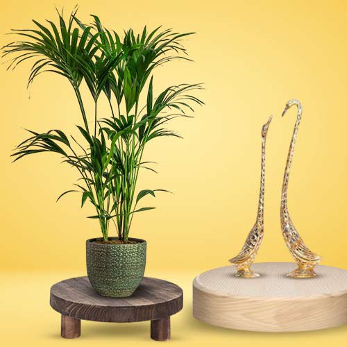 Deliver this Aesthetic Combo of Kentia Palm Plant N Decorative Love Birds Figurine to deliver happiness into the lives of the people you love. Product Details: a) Kentia Palm Plant b) Decorative Metal Love Birds Figurine