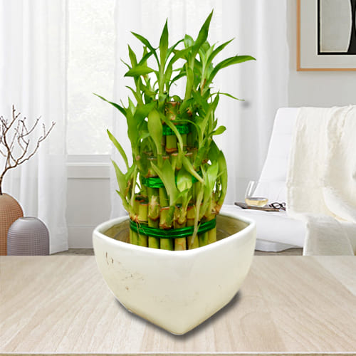 Paint a smile on the faces of the closest people in your life by sending this Divine Selection of 3 Tier Good Luck Bamboo Plant in Ceramic Pot that carries the essence of the feelings for them straight from your heart.