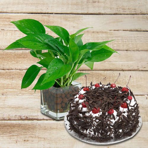 Send your best wishes by delivering this Good Luck Money Plant in Glass Pot with Yummy Black Forest Cake Combo-1lb to the people close to you and make them surprised and happy. Plant Type - Medical Benefit/Refreshing Plant Size - 3 to 7 inch Pot Size - 3 to 4 inch