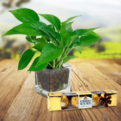 Create magical moments by ordering online this Good Luck Rubber Plant N Chocolate Gift Pack for your loved ones and spread your warm feelings into their hearts. This Fast-growing Air Purifying Plant comes in a Plastic Tub and added with 4 pcs Ferrero Rocher and 2 pcs Cadbury Temptation Chocolate Bar (72 gm. each). Plant Type - Indoor - Air Purifying Plant Size - 3 to 7 inch Pot Size - 3 to 4 inch