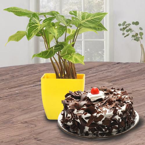 Send this nicely presented gift of Exotic Indoor Decor Syngonium Plant in a Plastic Pot with 1 Kg Black Forest Cake and let someone know that you have feelings for him/her. Plant Type - Indoor - Air Purifying Plant Size - 3 to 7 inch Pot Size - 3 to 4 inch