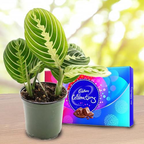 Create special moments with this Eye-Catching Gift of Maranta Prayer Plant with Chocolates when you are together with your loved ones. This lovely Gift of Air Purifying Maranta Prayer Plant comes presented in a Plastic Tub is included with a Cadbury Celebration Pack. Plant Type - Indoor - Air Purifying Plant Size - 3 to 7 inch Pot Size - 3 to 4 inch