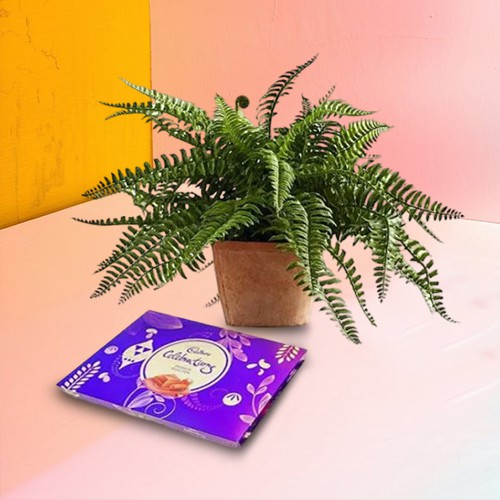 Order online this Festive Combo of Air Purifying Bostern Fern in a Plastic Pot N Chocolate for the people who deserve your love and special attention. This beautiful Gift Combo comes with Assorted Cadbury Celebration Pack (126 gm.). Plant Type - Indoor - Air Purifying & Medical Benefit Plant Size - 3 to 7 inch Pot Size - 3 to 4 inch