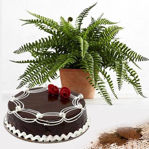 Send this gift of Exquisite Air Purifying Live Plant with Chocolate Cake and make someone feel truly special. This exciting Gift pack features Bostern Fern Plant in Plastic Pot and 1/2 Kg Chocolate Cake. Plant Type - Indoor - Air Purifying & Medical Benefit Plant Size - 3 to 7 inch Pot Size - 3 to 4 inch