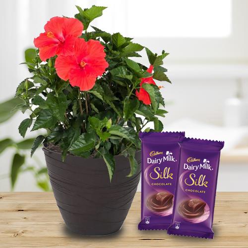 Click to deliver this Blossom-Filled Hibiscus Flowering Plant N Chocolate Duo that delivers happiness instantly when unwrapped. This angelic Flower Plant comes presented in a Plastic Pot combined with 2 pcs Cadbury Dairy Milk Silk Chocolates (60 g. each) Plant Type - Indoor - Flowering Plant Plant Size - 3 to 7 inch Pot Size - 3 to 4 inch