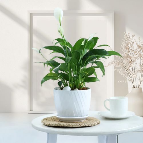 The Tranquil White Line Vase Set invites serenity into any space with its classic design and vibrant greenery. This carefully curated set includes a Peace Lily, celebrated for its lush foliage and air-purifying abilities, housed in a striking vase with a clean, white line finish. The accompanying platter ensures youll have a worry-free watering experience. This dynamic duo not only inspires peace and relaxation but is also exceptionally easy to care for, thriving in low-light and low-maintenance conditions. Its an ideal choice for busy individuals who appreciate beauty and simplicity. Theres something truly inviting about the balance of the Peace Lilys natural aesthetics and the vases modern design�perfect for those who long to create a serene oasis in their home or office. Each sip of water is a step toward a healthier, soothing environment.