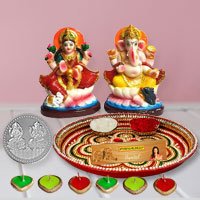 Puja Thali with Puja Samagri Packet with Lakshmi Ganesh Idols N Haldirams Kesar Peda 500 Gms.