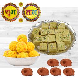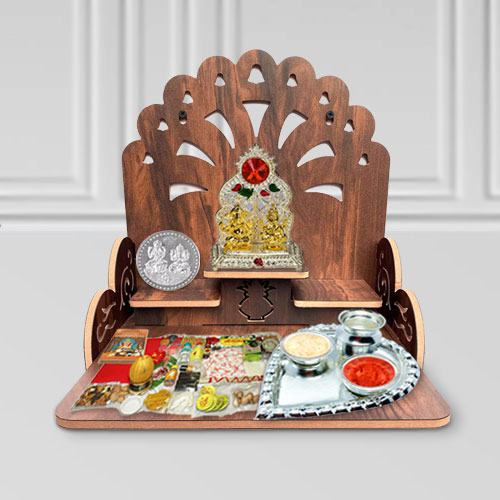 Make occasions grander with this Divine Combo of Wooden Temple N Pooja Essentials and share the moment with your loved ones. The details are given below- 1. Wooden Temple (Material: Wood, Size: 28 x 28 x 26 cm, Color: Brown) 2. Ethnic Ganesh Laxmi Mandap 3. Silver Plated Paan Shaped Pooja Thali 4. Silver Plated Ganesh Laxmi Coin 5. Pooja Samagri 6. Ghee Ladoo from Haldiram/Bhikaram (net wt. 200 gm)