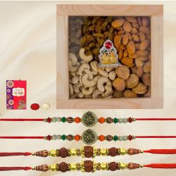 Add a magical charm to the festive mood of Raksha Bandhan by ordering online this Attractive Set of 2 Rakhis with Dry Fruits Tray, whose beauty is elegantly amplified in the presence of free Rakhi Card and free Roli, Tilak and Chawal. This exclusive Dried Fruits Wooden Tray contains Turkish Apricot (200 g), Salted Pistachio (200 g), Dried Strawberry (200 g) and Chocolates Coated Almonds (200 g).
