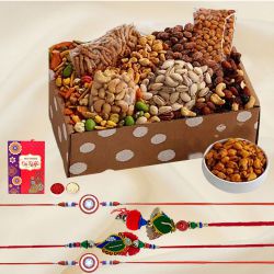 This is a gift of : � An Elegant Stone studded Rakhi � 200g of Masala Cashew and 200 g of Salted Cashew � Two Tone Silver Plated Bowl N Tray Set � Free Roli Tika n Chawal � A free Rakhi Card with personalized message.