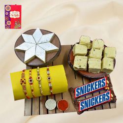 This Rakhi gift is presented with: � A Family Rakhi Set � 2 Tier Lucky Bamboo Plant with a Plastic Pot � Haldiram Rasgulla (500 gm) � Haldiram Khatta Meetha Pack (200 gm) � 2pc Cadbury Dairy Milk Chocolate Bar (13.2 gm) � A Free Rakhi, Roli Tika N Chawal included