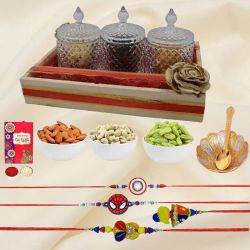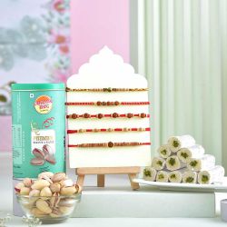 This gift set includes � Assorted Sweets (500 gms) � Set of 3 Rudraksha Rakhi � Cadbury Nutties Chocolate Box (36gms) � Ganesh Laxmi Mandap � Assorted Dry Fruit (250gms) � Free Rakhi, Roli Tika �N �Chawal included