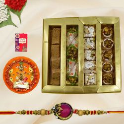This gift set has: � A Fancy Rakhi � A Box of Assorted Sweets (500 gms) � Free Rakhi � Complimentary Roli Tika �N �Chawal included.
