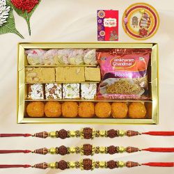 This gift set has: � Assorted Sweets (500 gms) � Set of 3 Rudraksha Rakhi � 16 pcs Ferrero Rocher Moments � Haldiram Bhujia (100g) � Free Rakhi, Roli Tika �N �Chawal included
