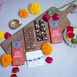 Bring home joy, blessings, and delicious treats with this Rakhi gift set designed to honor sibling love. The box includes 2 beautifully crafted Auspicious Rakhis, along with 500g of assorted sweets for a taste of classic celebration. The two Snickers Almond Bars (25g each) are a chocolaty treat your brother will love, while the 100g Almond Potli adds a touch of nutritious indulgence. Accompanied by complimentary Rakhi, roli, tika, and chawal, this hamper is a ready-to-gift token of love and togetherness.