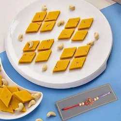 Order from miles away from your loved ones, this Auspicious Rakhi n Sweets Treat accentuated with your love to make their Raksha Bandhan special. This Rakhi combo comes with a platter of Kaju Katori (4 pc), Mawa Gilory (4 pc), Kaju Butter Scotch Ball (4 pc), Besan Moong Laddoo (3 pc), Khajur Dry Fruit Laddoo (3 pc), Set of 2 Auspicious Rakhi and Free Rakhi, Roli Tika N Chawal included.
