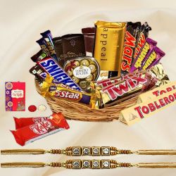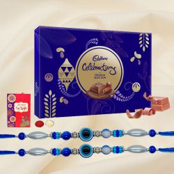 This gift set has: � Set of 2 Fancy Rakhi for Brothers � Cadbury Bournville Chocolate Bar (Fruit n Raisin, 45g) � Cadbury Dairy Milk Silk Chocolate Bar (55g) � Cadbury Dairy Milk Fruit n Nut Chocolate Bar (36g) � Free Message Card with Roli Tika, Chawal n Mouli Rakhi � Rakhi Gift Envelope