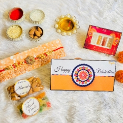 Make this Raksha Bandhan extra special with a gift set that brings together sweet indulgences and sacred tradition. Featuring two auspicious rakhis, this combo is perfect for expressing your love and gratitude to your siblings. The chocolate selection includes three irresistible bars�Cadbury Dairy Milk Silk Hazelnut (55g), Dairy Milk Silk (55g), and Dairy Milk Fruit & Nut (36g)�ideal for sharing joy and sweetness. Also included are all essentials for the Rakhi ceremony: roli, tika, chawal, and mouli, as well as a free message card for a personalized touch and a festive gift envelope for elegant presentation. This set is a beautiful way to create cherished memories