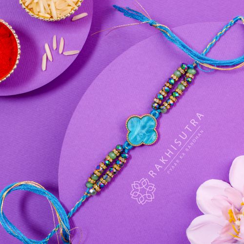 Gift this Turquoise Rakhi for Brother in a Box and Free Message Card with Roli Tika, Chawal N a Free Mouli Rakhi to keep your beloved smiling and happy on Raksha Bandhan.