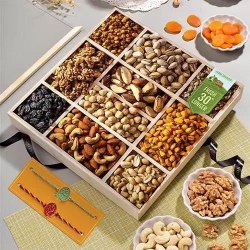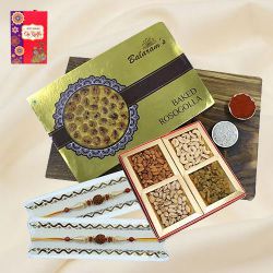 This gift set has: � Rakhi Pack of 4, � Kachori (160 gms) � Kaju Katli (250 gms) � Roasted Cashew (100 gms) � Roasted Almond (100 gms) � Free Roli & Chawal