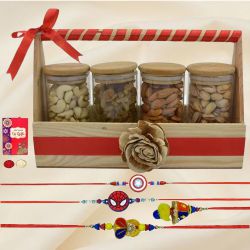 Introducing the Sibling Surprise: Rakhi Combo, a perfect gift package designed to celebrate the joyous occasion of Raksha Bandhan. This exquisite combo is carefully curated with love and thoughtfulness, encompassing four beautifully designed Rakhis, a delectable assortment of sweets, and a savory blend of roasted cashews and almonds. In addition, we are delighted to offer free Roli and Chawal, ensuring a complete Rakhi experience.