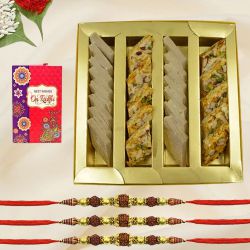 Introducing the Ganesha Rakhi Gift - a perfect blend of sweetness and tradition! This beautifully curated set includes five elegantly designed Ganesh Rakhis, along with a delectable treat of Milk Cake Mawa Sweet weighing 200g. As an added bonus, we have included free Roli and Chawal to complete the auspicious rituals of the festival.