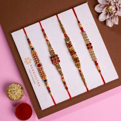 This gift set has: � Four Evil Eye Rakhi Set - Type: Designer Rakhi - Material: Metal - Colour: Multicolor - Rakhi Design Code: SAJEVKAD036, EVD7515, EVD7508, EVD8956AN