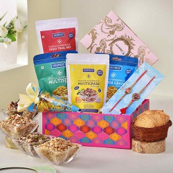 This gift set has: � Designer Om Rakhi � Cadbury Temptation Almond Treat Chocolate Bar 72gm � 4 pcs Ferrero Rocher Chocolate � Designer Metal Container