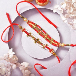 Add a magical charm to the festive mood of Raksha Bandhan by ordering online this Amazing Kundan N Meena Bhai Bhabhi Rakhi whose beauty is elegantly amplified in the presence of complimentary Roli, Tilak and Chawal. The rakhi has a metal base in the center which is craftfully engraved and has ad kundans in it. The Lumba band has a designer gota at the center with stones and has been made with fine jari work to add to the beauty for this pair rakhi.