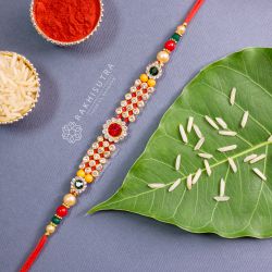 Add to the charismatic Raksha Bandhan, order online this gift of Attractive Fancy Kundan Rakhi supplemented with a Rakhi, Roli, Tilak and Chawal free of cost.