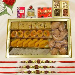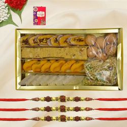 � Three Kundan Rakhi - Type: Designer Rakhi - Material: Metal - Colour: Multicolor - Recipient: Brothers � Milk Cake from Bhikharam Chandmal, 500g � Complimentary Roli Tika N Chawal � A Free Message Card is also Included