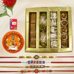 Product Details: This is a gift of : � Two Kundan Rakhi Set - Type: Designer Rakhi - Material: Metal - Colour: Multicolor - Recipient: Brothers � Kesaria Peda from Bhikharam Chandmal 500g � Complimentary Roli Tika N Chawal � A Free Message Card is also Included