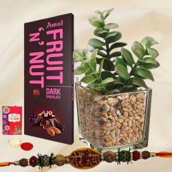 Make this Raksha Bandhan unforgettable with a beautiful gift combo that speaks of love and tradition. It features a Designer Kundan Rakhi made with high-quality metal, kundan, and multicolored beads that beautifully enhances the celebration. A lovely Aglaonema Lipstick Plant in a charming pot adds a refreshing green vibe to the day, symbolizing your evergreen bond. Complemented by 12 pieces of mouthwatering handmade chocolates and a heartfelt card, this combo is a perfect blend of elegance and emotion. With complimentary Roli, Chawal, and Tika, along with a free message card, this gift set is a complete Rakhi celebration in a box. (Rakhi Design Code: RKCARD3357A)
