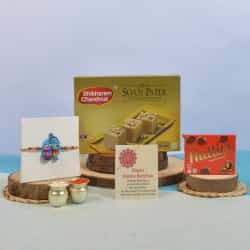 This Raksha Bandhan, delight your young brother with a gift set that�s both exciting and meaningful. Featuring two vibrant silicone rakhis�one inspired by the mighty Hanuman (KRHAN5696) and the other by the ever-blessing Ganesha (KRGAN5698A)�this duo brings divine cheer to his wrist. Accompanying the rakhis is a 1kg box of juicy Rasgulla from Bhikaram Chandmal and three rich Dry Fruit Mewa Bite Chocolates for a perfect balance of tradition and taste. A sleek Snake Plant in a pot adds a modern, nature-friendly touch, known for purifying the air and bringing in luck. Rounding off the experience are complimentary Roli, Chawal, and Tika for the sacred rituals, and a free message card to add your loving words. Ideal for a brother who�s full of energy and spirit, this set celebrates Rakhi with sweetness, blessings, and style.