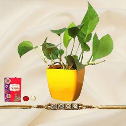 The Rakhi Gift Pack is a perfect blend of tradition, elegance, and freshness, curated to honor the precious bond with your brother. At its heart lies a designer Kundan Rakhi made of metal and embellished with colorful Kundan stones and beads, reflecting intricate craftsmanship and vibrant hues. This beautiful Rakhi is accompanied by a lush Syngonium plant in a pot, symbolizing growth and good luck. To add a sweet note to your celebration, you�ll receive 10 baked Rasogolla pieces from Balaram�s, renowned for their authentic taste. The pack also includes complimentary Roli, Chawal, and Tika to uphold the sacred Rakhi rituals, and a free message card to convey your deepest sentiments. Together, these elements make this Rakhi Gift Pack a heartfelt and memorable way to celebrate Raksha Bandhan (Rakhi Design Code: PRRK8260).