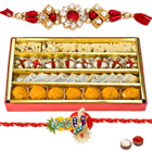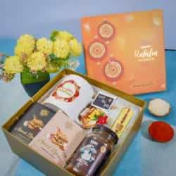 This gift hamper contains: � Three Ganesha Rakhi Set � Butter Badaam Cookies Tin Pack 160 Gms � Almond Flakes Cookies Tin Pack 175 Gms � Dry Fruits Cookies Tin Pack 160 Gms � 4 Pcs Ferrero Rocher Chocolate � A Designer Tray