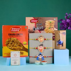 This beautifully composed Raksha Bandhan gift hamper brings together spiritual charm and gourmet indulgence. It includes a Three Ganesha Rakhi Set, perfect for expressing love and invoking divine blessings. The hamper delights further with a trio of cookie tins: Butter Badaam (160 gms), Almond Flakes (175 gms), and Dry Fruits (160 gms)�each baked to perfection with wholesome richness. To enhance the moment, 4 Ferrero Rocher Chocolates provide a touch of gold-wrapped luxury. All the elements come neatly arranged in a Designer Tray, making this a ready-to-gift box of love, taste, and tradition.