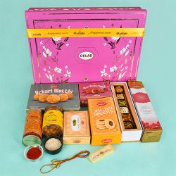 Prepare for the best Raksha Bandhan by ordering online this Rakhi with Chocolates n Dry Fruits Combo Box that is combined with Roli, Tilak and Chawal to beautify the event. This gift box has: 1. A Designer Rakhi - Design Code: EVD8956AN 2. Tiffiny Crunch n Cream 65g 3. Cadbury 5 Star 40g 4. Cadbury Dairy Milk Silk 60g 5. True Elements Dried Cranberry 30g 6. Roli Chawal Thali 7. Comes Elegantly Packed in a Box
